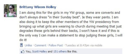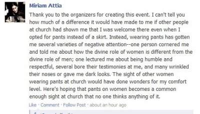 Have to admit, though…all this pants drama almost make me want to throw on a pair, and show up for a Sacrament Meeting just to watch it unfold.