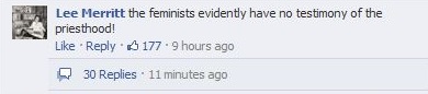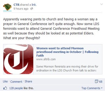 Well, the page does have a point in asking was praying in conference and wearing pants not enough for these feminists? I mean yeah sure, us men will still make all the major policy decisions and set gender dynamics in the family without consulting you ever, but in return you get to look fabulous every Sunday. What more could you possibly want from us?!?!? Wearing pants is a privilege we gave you.