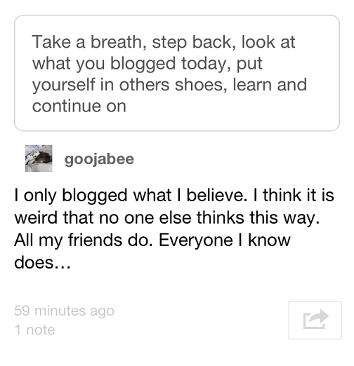 While I value your note that an online presence will require more thoughtful responses than are posted here, and while I certainly agree that these comments are amazingly terrible, I feel really uncomfortable about including posts from Emilie’s now-defunct tumblr. While it is entirely possible that she took it down because she didn’t like all the disagreement, it is also possible that she took it down because she regretted the things she said and felt shame that it was still out there–the ol’ Maya Angelou, “I did then what I knew how to do. Now that I know better, I do better.” And without Emilie giving her reasons why she left, I think it is worth giving her the benefit of the doubt.