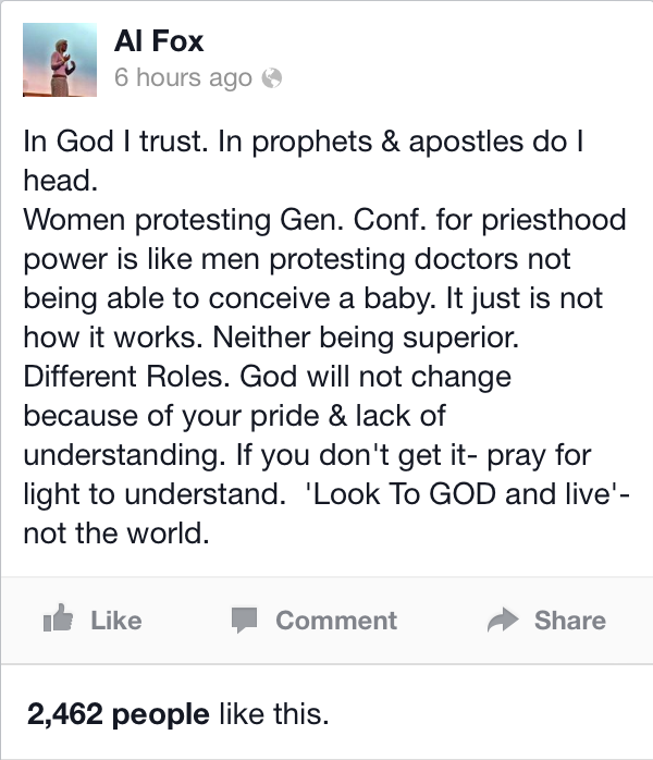 For those unfamiliar, Al Fox is a prominent LDS blogger/speaker. She is pretty well known for her online presence via her blog and YouTube videos. She also travels a lot doing firesides. If you support Ordain Women, Al Fox is not your biggest fan.
