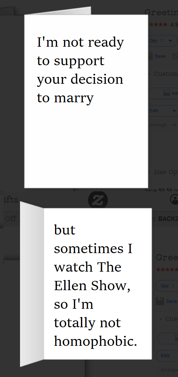 I am not here to have a huge discussion about my beliefs about same-sex marriage, same-sex attraction, etc. Putting those things aside, do you really think creating a sarcastic and flat out rude blog post is going to change the way people think about same-sex marriage? I don’t know why you would write and publish something that publicly declares the “stupidity” of people who believe in traditional marriages only. How can you ask others to be open-minded when you are being so close-minded yourself? None of these cards are an accurate reflection of my reaction (and I would think it would be the same for others, but I’ll only speak for myself) to a friend or family member having a same-sex marriage.