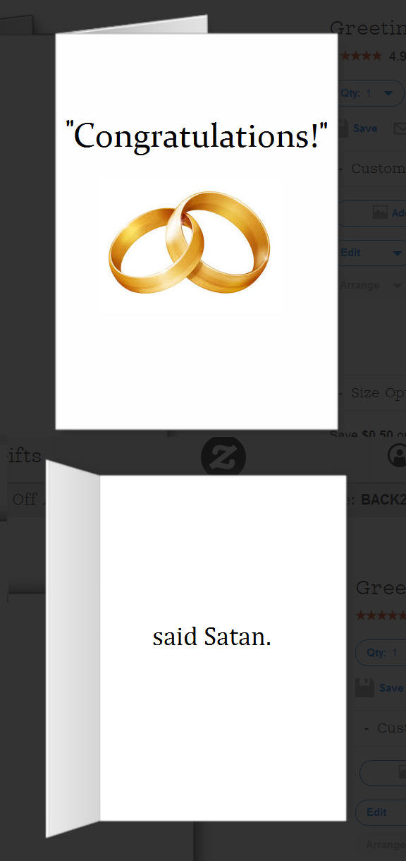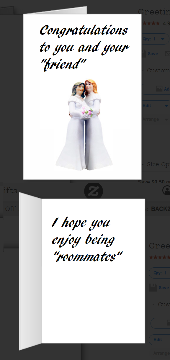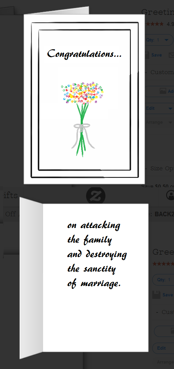 Oh. My. Heck. I about died at the “but wickedness never was happiness” card. I’d add a card that says something like “Congratulations on your same-sex union. We’re calling it that because you’re straight, but same-sex married.”