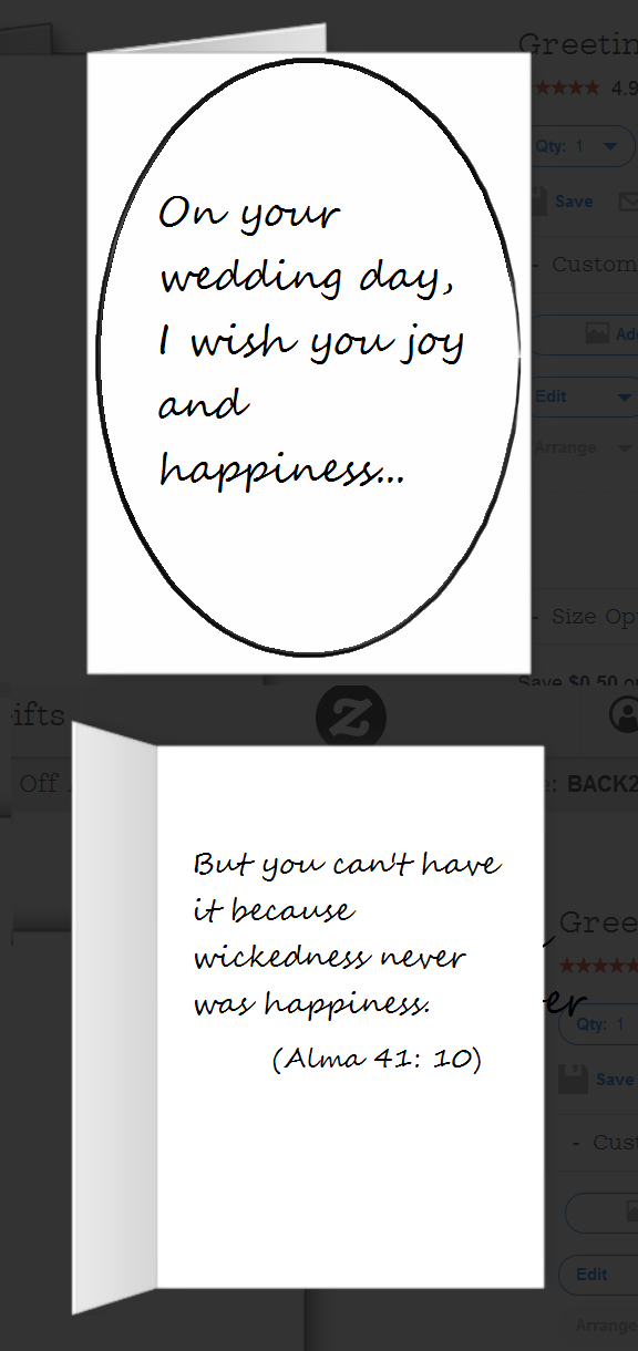Naysayers of BYU aside, the greeting card scandal has opened up a platform to talk about a very important question (and of course this question is not women’s ordination, because that question has been satisfactorily answered. get out.). Namely, what kind of card should a righteous, opposite-sex loving, traditional marriage supporting, young Mormon BYU student send when they are invited to a same-sex marriage? Where can they find a card that sends a Christ-like message of love and acceptance while also sending a Boyd K. Packer-like message of hellfire and damnation?