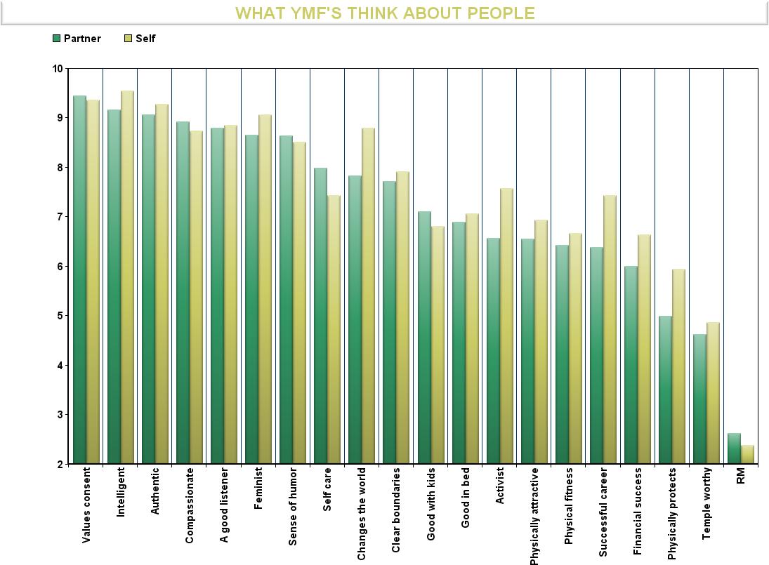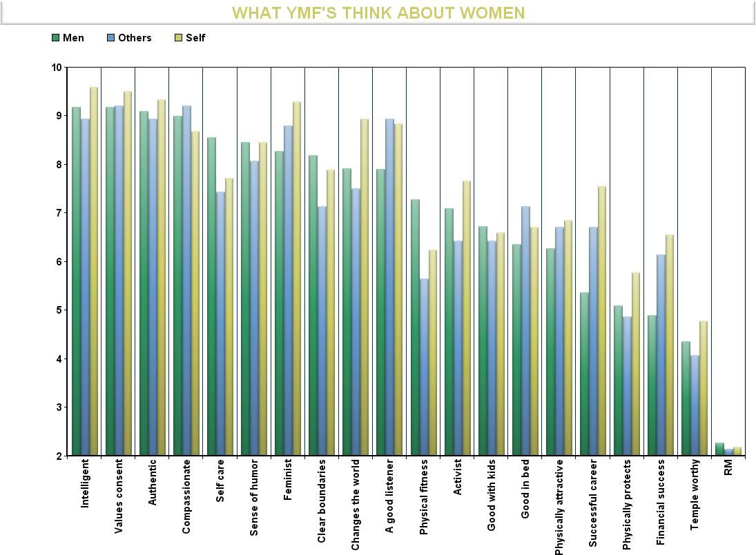 The graph is notable for the disparity on the right end between what Mormon women valued in themselves and what men valued in women. Some YMFers were naturally curious how young people who identify as Mormon and feminist would respond differently to a survey like this one. This article is a report on the results of that survey.