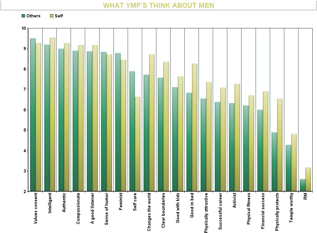 And finally, here is the graph for 1) what qualities men value in themselves as well as 2) what qualities those who are attracted to men value in men.