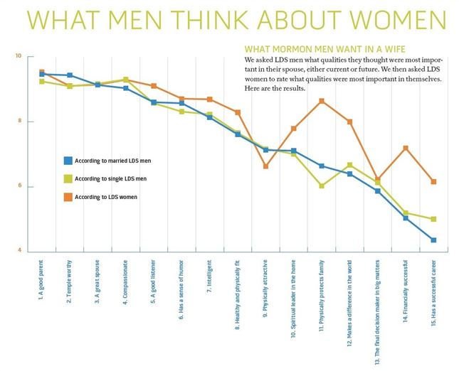 A while ago, LDS Living magazine ran a survey to find out what qualities Mormon men value in their future/current spouses. They then asked Mormon women what qualities they valued in themselves and compared the results.