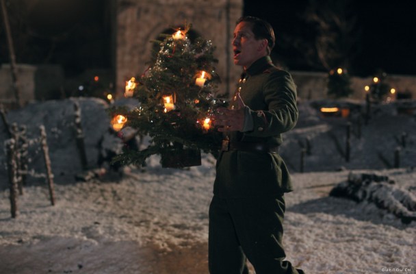 Joyeux Noel is a depiction of one such ceasefire. A famous German singer has come to entertain his country’s troops on Christmas Eve, and in the midst of a carol he is suddenly joined by bagpipes from the enemy Scottish trench. The next moment is one of the most powerful things I’ve ever seen in a movie. The German continues singing as he climbs out of the trench, carrying with him a small Christmas tree which had been sent to cheer up the soldiers. Others try to hold him back, insisting it’s a trap, but he ignores them. Singing “Oh Come All Ye Faithful,” he walks through the snow and places the small tree in between the trenches, bowing humbly as he finishes his song. Other soldiers follow suit, and the celebration begins.