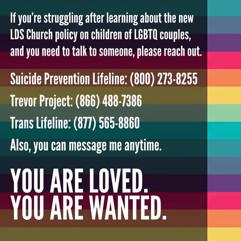 I volunteer as a crisis line worker at a suicide prevention line. Over the past month, I’ve observed an increase in calls coming in from LGBTQIA individuals, specifically ones who were raised Mormon, or who identify as Mormon. This doesn’t surprise me, given the new handbook policy that the LDS church came out with recently. Still, it deeply saddens me.
